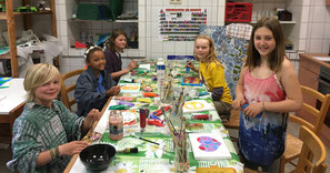 Danach hat die gesamte Gruppe mit Ton gearbeitet. Es wurde fleißig modelliert und es entstanden viele Tiere, Kugeln, Würfel und Schalen. Anschließend haben sie sich wieder in zwei Gruppen aufgeteilt. Die eine Hälfte hat weiter mit Ton gearbeitet, die andere hat sich der Aquarellmalerei gewidmet. Es wurden dabei die Besonderheiten der Aquarellfarbe erläutert und auf „Probeblättern“ ausprobiert. Es entstanden zahlreiche, unterschiedliche Bilder mit Blumen, Landschaften, Sonnenuntergängen und freien Motiven. Die Motivwahl ist den Schüler*innen grundsätzlich freigestellt, es werden lediglich einzelne Motive vorgestellt und der dazugehörige Bildaufbau erklärt.