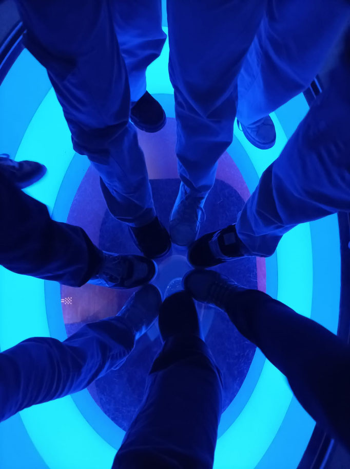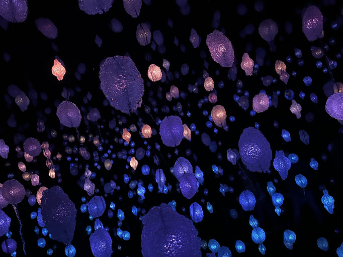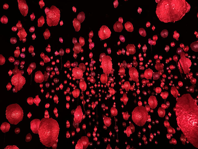Die Rauminstallation gleicht einem verwunschenen Wald, der sich im Museum ausgebreitet hat und lädt ein sich darin zu verlieren. Wenn man hindurchgeht, fühlt es sich magisch an. Überall verändern sich die Farben, es leuchtet und blinkt – für viele war das der Lieblingsraum des Tages.